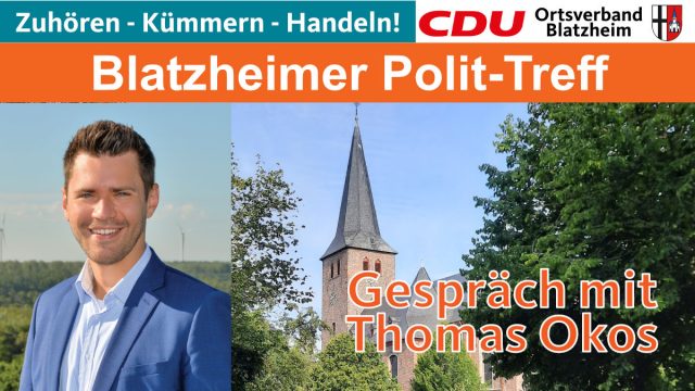 Den nächsten „Polit-Treff vor Ort“ veranstaltet die CDU-Blatzheim am Samstag, 02.04.2022, um 10.00 Uhr auf dem Pfarrer-Wolters-Platz.