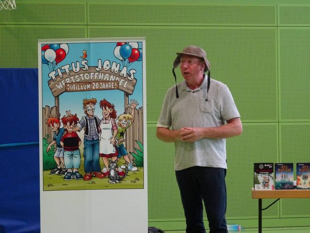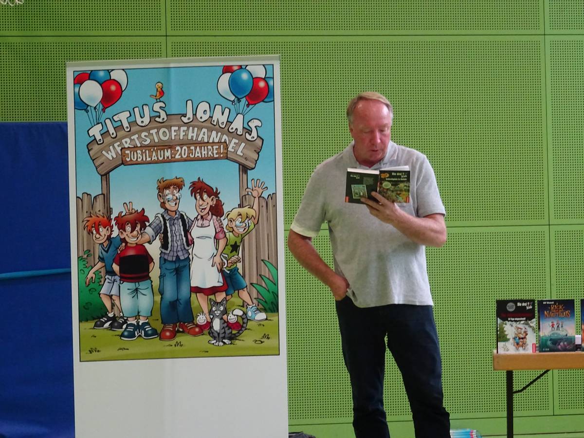Ulf Blanck hatte aber nicht nur die drei Fragezeichen im Gepäck, er stellte auch seine neue Buchreihe vor, die ihm, wie man merkte, sehr am Herzen liegt. In die Reihe „Rick Nautilus“ ließ und lässt er wunderbare Kindheitserinnerungen einfließen, die er als junger Segler mit seiner Liebe zum Meer sammeln konnte. Ihn fasziniert der Gedanke, dass die Meere noch recht unerforscht sind und sich somit unendliche Möglichkeiten bieten, sich zu überlegen, welch spannende Lebewesen dort leben könnten. Der Autor ließ die Kinder auch direkt in die abenteuerliche Welt unter Wasser eintauchen und machte sie mit Rick und seinen Freunden durch das Vorlesen einiger Seiten des ersten Bandes bekannt. Auch hier waren die Kinder begeistert und sie hätten sicher auch noch gern weiter den Abenteuern gelauscht, aber die Zeit ging wieder einmal viel zu schnell um. Am Ende durften sich alle Kinder ein Autogramm und eine Leseprobe bei Ulf Blanck abholen und erhielten damit eine tolle Erinnerung an einen aufregenden Vormittag.