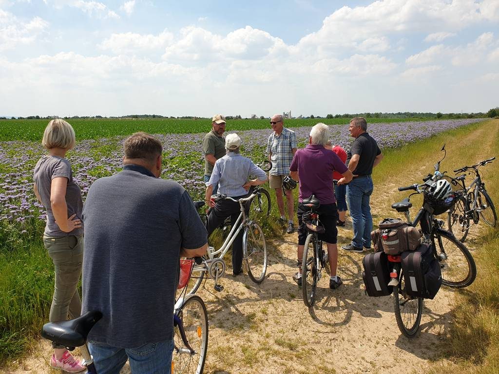 Mit dem Fahrrad erkunden die Teilnehmer die Umgebung von Blatzheim und diskutieren aktuelle Projekte vor Ort.