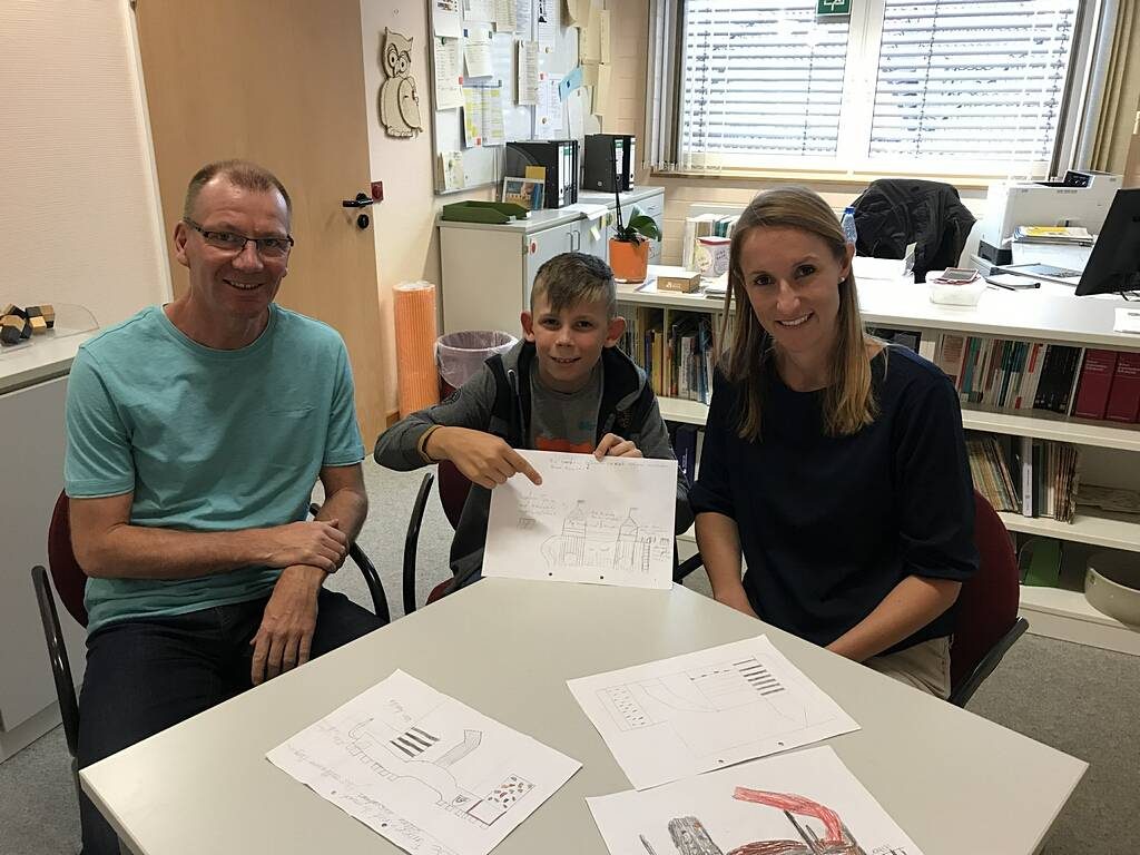 Die Jury wählte den Vorschlag des 10jährigen Moritz aus. Bevor der Entwurf an die Stadt Kerpen weitergeleitet wurde, erläuterte der Schüler Katharina Kaulen (Kommissarische Schulleiterin) und Gerd Meyer (Leiter Kinder- und Jugendzentrum DOMIZIEL) seine sehr einfalls- und detailreiche sowie gut durchdachte Konstruktion. Die Beschreibung der Ideen wurde dann schriftlich ausformuliert, zum Teil noch ergänzt und im Anschluss daran dem Bauhof der Stadt Kerpen übergeben.