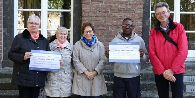 Neben der Freude über ein gelungenes Fest ist auch noch ein Erlös von rund 1.350 Euro übrig geblieben, der nun je zur Hälfte an Gerda Steffens von CuraCon Rhein-Erft und Pascal Fwansoni von „Wir für Kinkole“ übergeben wurde. Bei CuraCon soll das Geld für den Freizeitbereich von Menschen mit und ohne Handicap genutzt werden, wie z.B. die Musikgruppe „Offbeat“, die auch schon in Blatzheim aufgetreten ist. In Kinkole soll mit der Spende die dortige Schule gefördert werden.