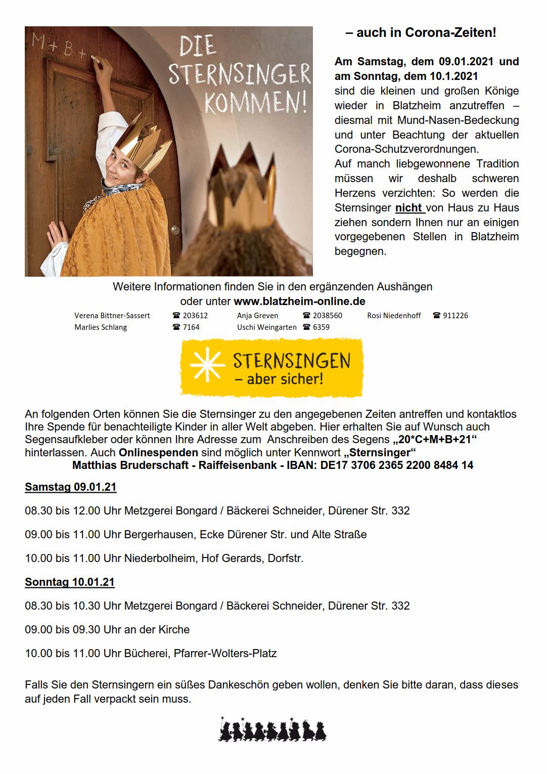 Am Samstag, dem 09.01.2021 und am Sonntag, dem 10.01.2021 sind die kleinen und großen Könige wieder in Blatzheim anzutreffen – diesmal mit Mund-Nasen-Bedeckung und unter Beachtung der aktuellen Corona-Schutzverordnungen. Auf manch liebgewonnene Tradition müssen wir deshalb schweren Herzens verzichten: So werden die Sternsinger nicht von Haus zu Haus ziehen, sondern Ihnen nur an einigen vorgegebenen Stellen in Blatzheim begegnen.