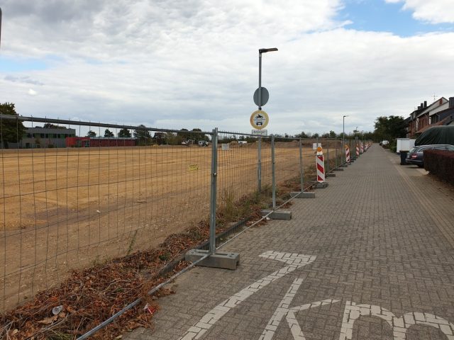 Nachdem die Arbeiten zum Rückbau des Sportplatzes nahezu abgeschlossen sind, sollte auch der Bauzaun versetzt werden, damit der Buschweg und die Kunibertusstraße ungehindert befahrbar sind. Ansonsten kommen dorr Fahrzeuge nicht aneinander vorbei, was dazu führt, dass auf der Kunibertusstraße auf den Gehweg ausgewichen wird.