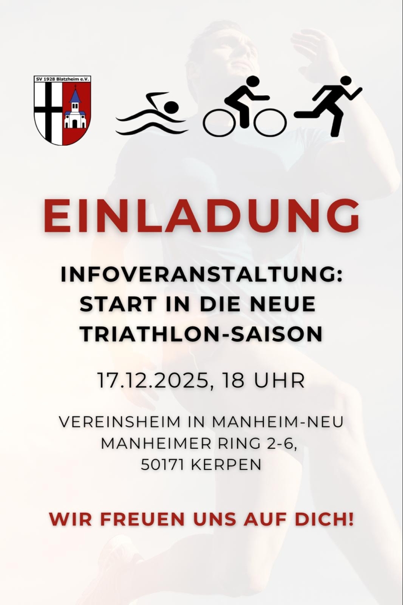 Am kommenden Mittwoch, 17.12.2025, findet um 18.00 Uhr im Vereinsheim des SV-Blatzheim auf dem Sportplatz in Manheim (Manheimer Ring 2-6) ein Infoabend zum Start in die neue Triathlon-Saison statt.