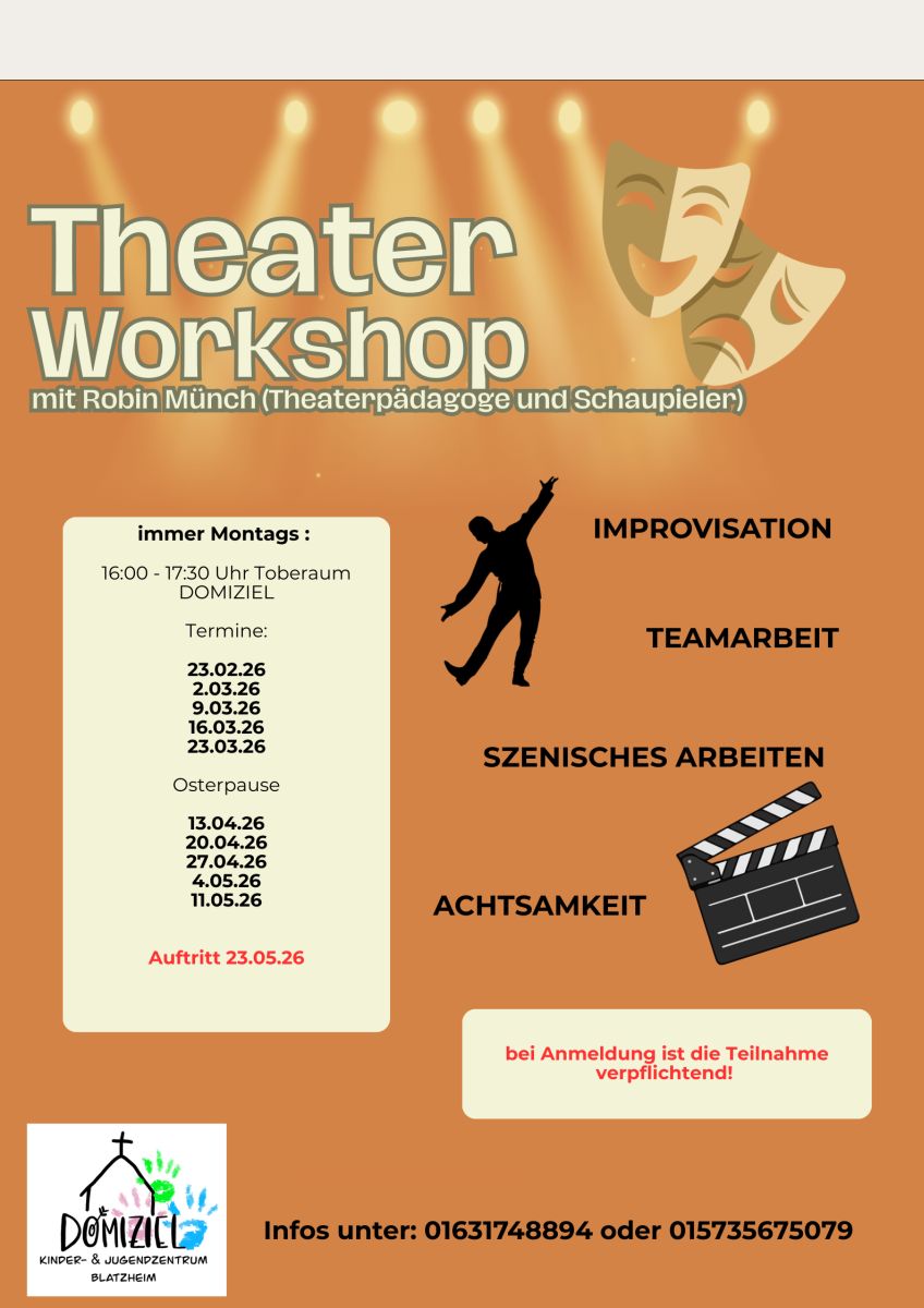 Nach Karneval startet montags von 16.00 Uhr bis 17.30 Uhr ein Theater-Workshop im Kinder- und Jugendzentrum DOMIZIEL. Start der 10 Termine ist Montag, 23. Februar.
