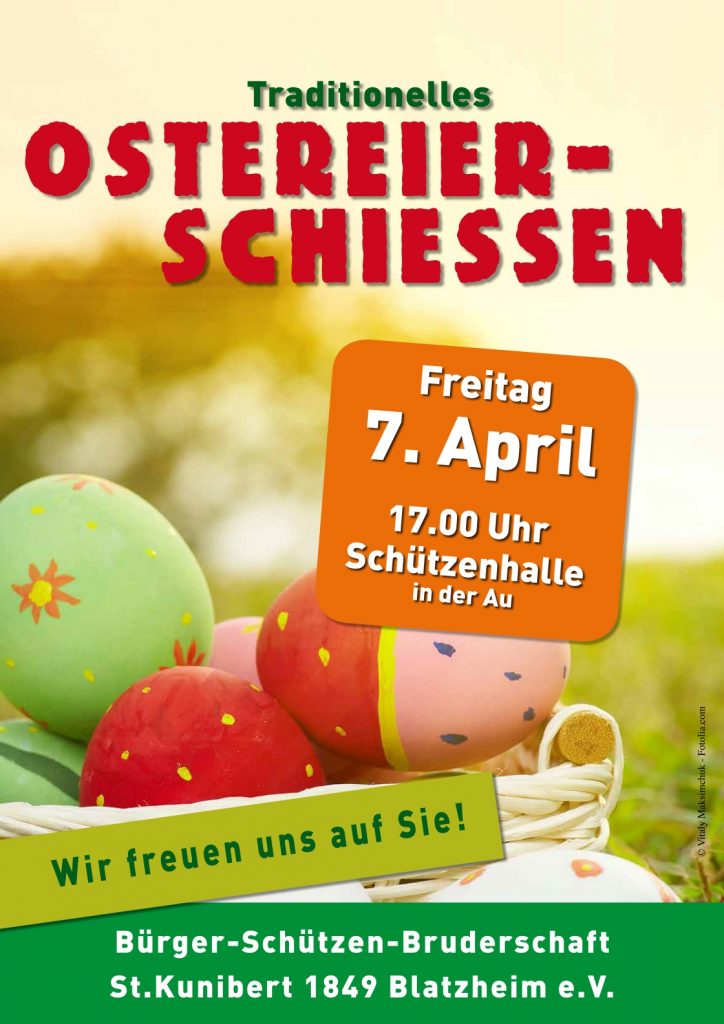 Zum traditionellen Ostereierschießen lädt die Schützenbruderschaft ein. Am Freitag, dem 7. April findet das Schießen ab 17.00 Uhr in die Schützenhalle (In der Au) statt.
