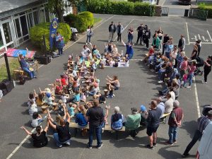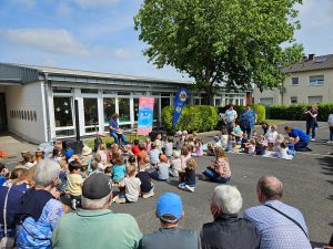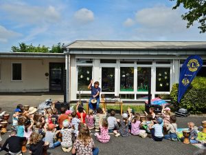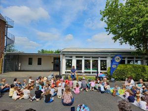 Die Kinder haben am Vormittag in zwei kleinen Gruppen schon alles einstudiert. Die Zuschauer durften dann dem folgenden Konzert beiwohnen und auch selbst mitklatschen, -tanzen und -singen. Da auch Petrus den Kindern wohl gesonnen war, konnte das Konzert bei bestem Wetter auf dem Hof genossen werden.