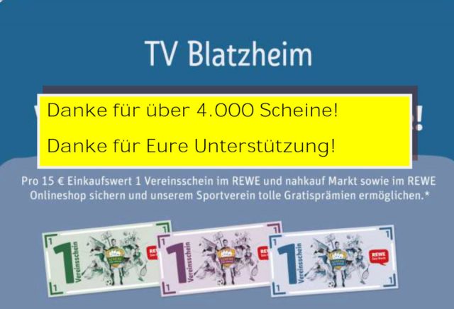 Der TV Blatzheim bedankt sich ganz herzlich bei allen Unterstützern! Für den Verein wurden über 4.000 Vereinsscheine eingelöst!
