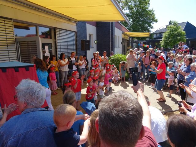 Nach der Begrüßung durch Leiterin Alexandra Lauterbach ging es direkt mit einer Tanzaufführung der Midis los. Und aus dem KiTa-Container enterten dann die Maxis als „Piraten“ verkleidet das Sommerfest der Rasselbande.