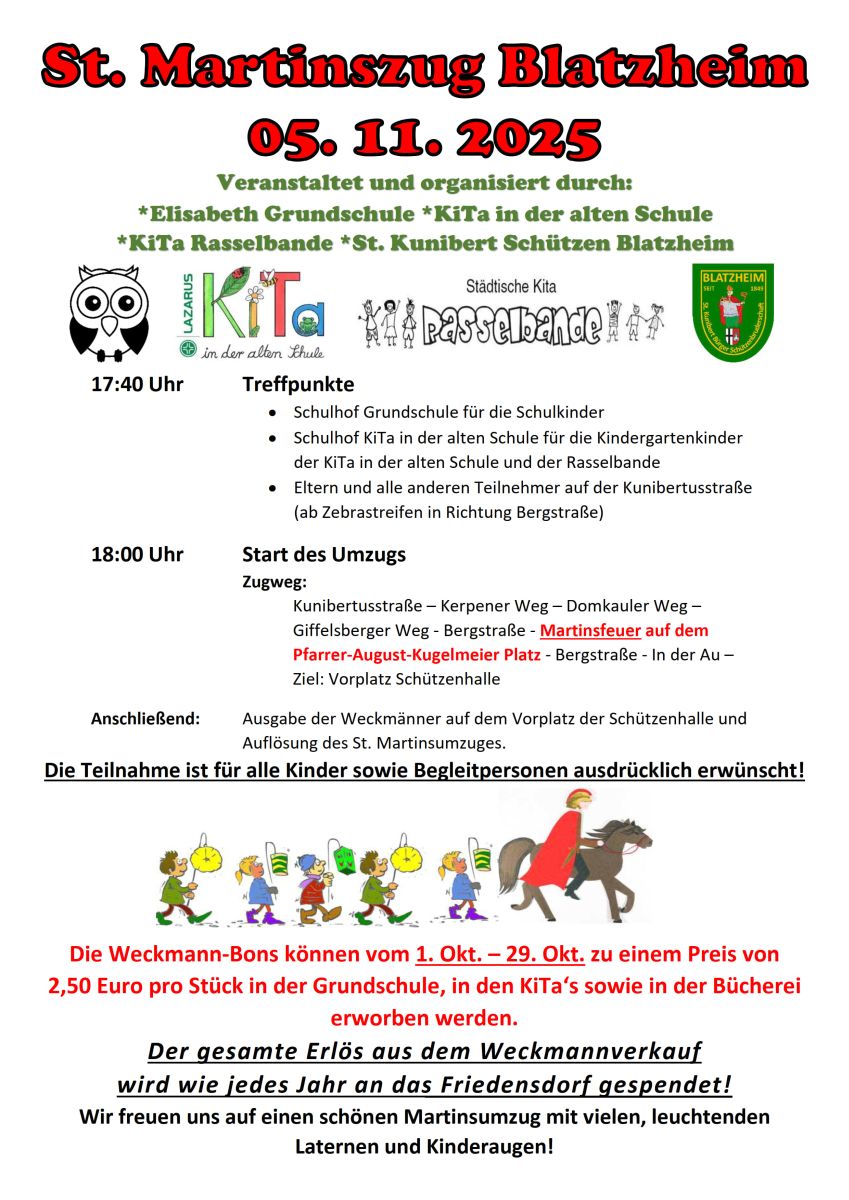 Am Mittwoch, 5. November, findet in diesem Jahr der große Martinszug der Grundschule gemeinsam mit der „KiTa in der alten Schule“, der KiTa Rasselbande und der Schützenbruderschaft statt. Der Martinszug startet um18.00 Uhr rund um die Schule und endet nach dem Martinsfeuer auf dem „Pfarrer-August-Kugelmeier-Platz“ an der Schützenhalle. An der Schützenhalle findet auch die Ausgabe der Weckmänner statt.