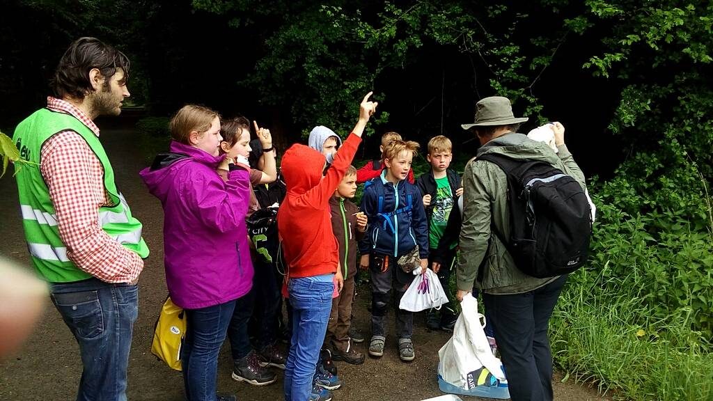Jede Menge zu entdecken gab es für rund zehn Kinder des Kinder- und Jugendzentrums DOMIZIEL, die sich am 18. Mai bei leider leichtem Regen mit dem Fahrrad nach Geilrath zur Steinheide aufmachten, um dort unter Anleitung der BUND-Vorsitzenden Jutta Schnütgen-Weber den Waldboden zu erforschen.