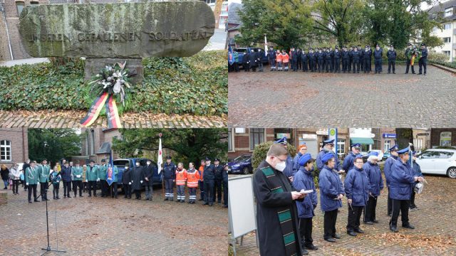 Die Kranzniederlegung wurde vom Tambourcorps Edelweiß Blatzheim begleitet. Auch DRK, Feuerwehr und Schützen haben in Uniform mit großen Abordnungen neben anderen Vereinen und dem stellv. Landrat Bernhard Ripp und Besuchern der Sonntagsmesse an der Gedenkfeier teilgenommen. Pastor Pitzen trug für die Kirche ein Gebet vor.