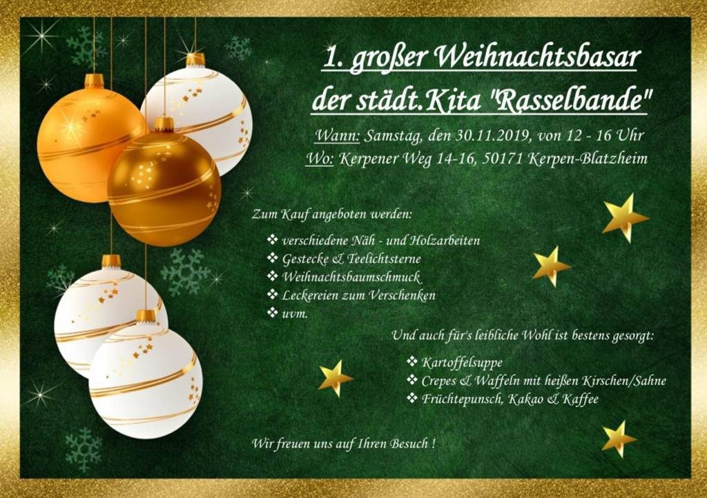 Am Samstag, 30.11.2019, veranstaltet die städt. Kita „Rasselbande“ in der Zeit von 12.00 Uhr bis 16.00 Uhr ihren 1. Großen Weihnachtsbasar.