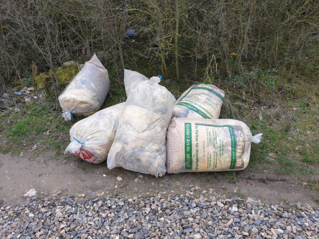 Es ist schon makaber, wenn Leute ihren Müll auf Tüten in der Landschaft entsorgen auf denen steht „Ihr Partner für den Umweltschutz“.  So liegen etliche mit Glaswolle gefüllte Säcke am Weg zwischen Niederbolheim und Giffelsberg.