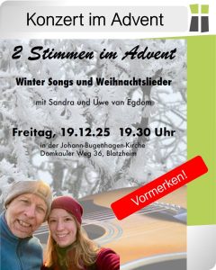 Winter Songs und Weihnachtslieder in der ev. Kirche 07.12.2025 Blatzheim-Online 0 Comments Unter dem Titel “2 Stimmen im Advent“ präsentieren Sandra und Uwe van Egdom am Freitag, 19 Dezember 2025, um 19:30 in der Johann-Bugenhagen-Kirche am Domkauler Weg Winter Songs und Weihnachtslieder. Der Eintritt ist frei. Spenden sind willkommen.