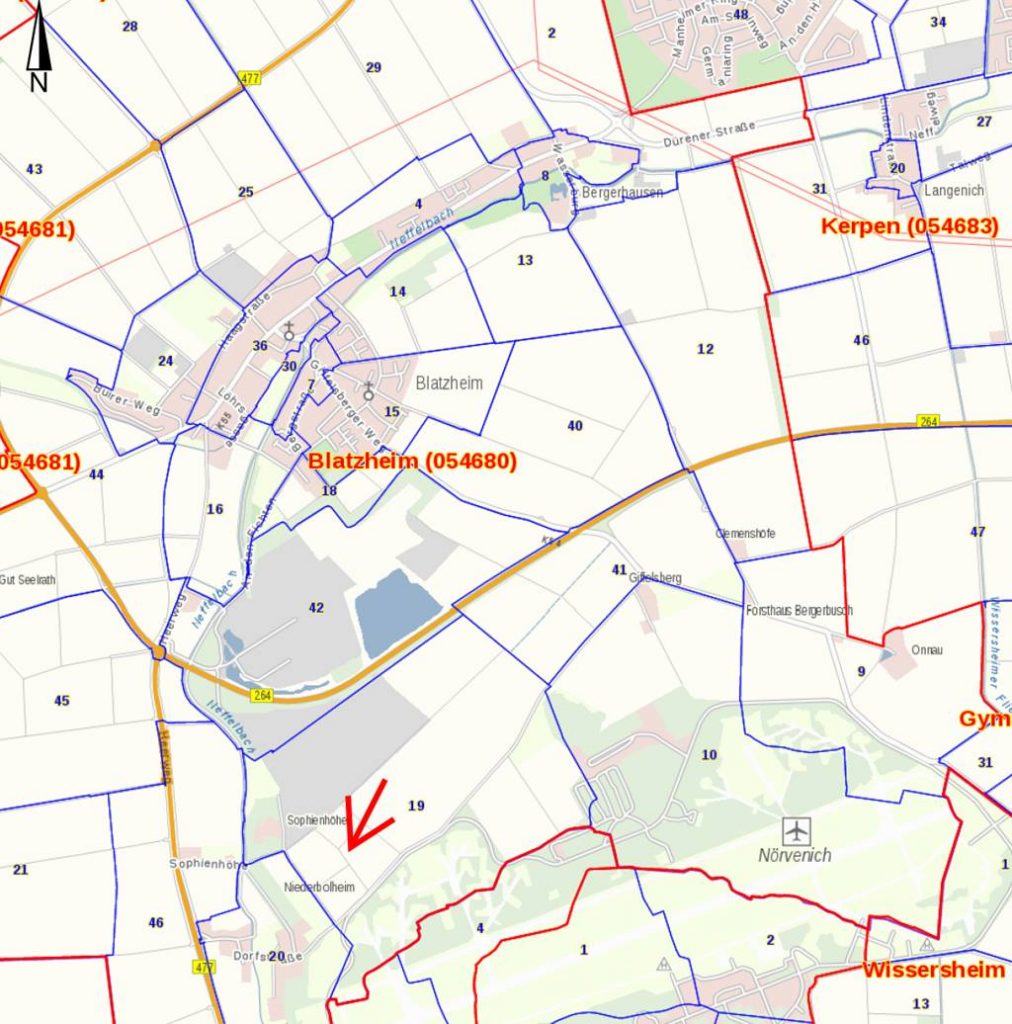 Betroffen sind die (Teil-)Flächen in der Gemarkung Blatzheim, Flur 42, Flurstück 28 und Flur 19, Flurstücke 3, 12, 19, 29, 14, 22. Gemäß den Auskiesungspachtverträgen zum Abbau von Sand und Kies werden die oben näher beschriebenen Wege bzw. Wegabschnitte sukzessive in Anspruch genommen.